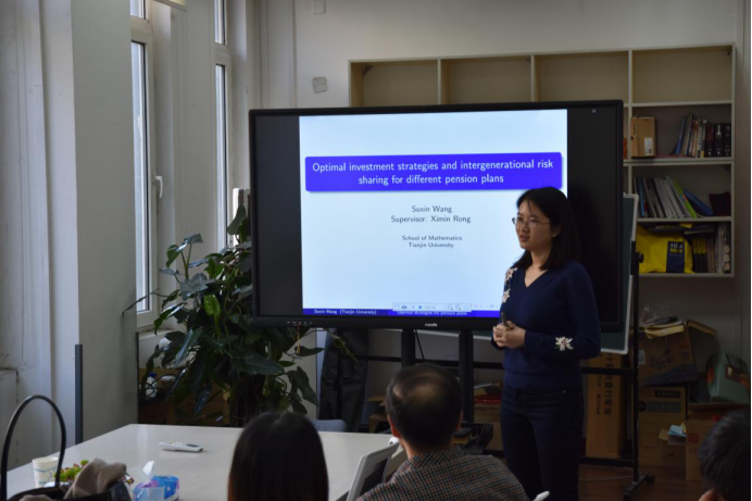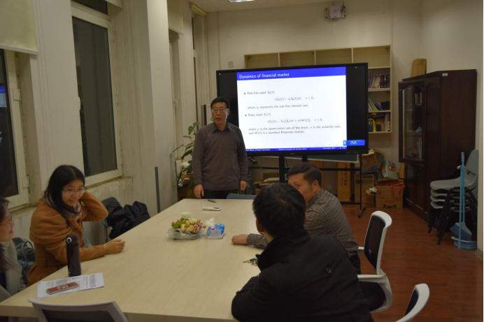 荣喜民教授团队汇报分享了最新的研究成果,其中荣喜民教授做了题为“Dynamics of financial market”的学术报告,赵慧老师做了题为“随机保费收入的保险投资模型”的报告;博士生王愫新做了题为“Optimal investment strategies and intergenerational risk sharing for different pension plans”的报告。