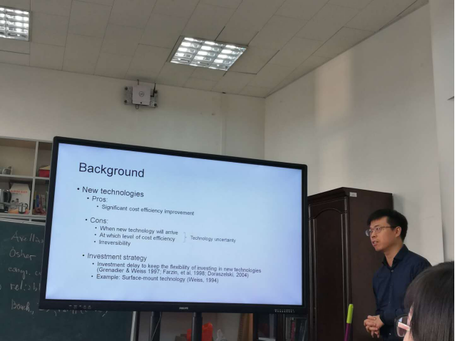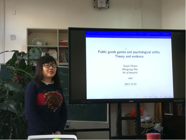 2017年12月22日,我校国际经济管理研究院尉孟星博士、叶芳林博士来我中心交流,分别做了题为“Public goods games ans psychological utility theory and evidence”、“Optimal investment under technological change”的学术报告。