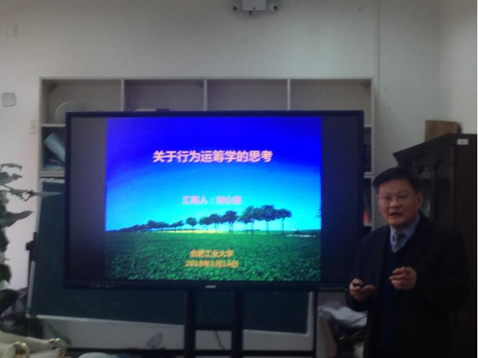 2018年1月14日上午,合肥工业大学刘心报教授应邀来我中心开展合作交流,在E209做了题为“关于行为运筹学的思考”的学术报告,与中心师生展开了积极热烈的讨论。