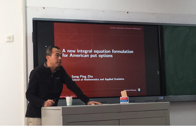 2018年1月,澳大利亚卧龙岗大学数学与应用统计学院院长Zhu Songping教授应邀来我中心开展交流。1月29日上午Zhu教授在E206做了题为“A new integral equation formulation for American put options”的专题讲座。